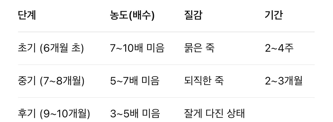• 농도 갑자기 되직하게 → 삼키기 힘들어 구토·거부감 가능, 점진적 변화.